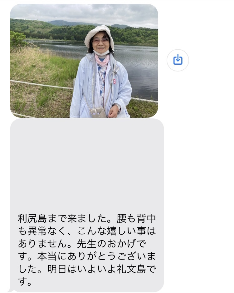 私は身体のことが全然分からなかったけど、先生に治療していただくうちに、色々聞いて徐々に身体のことを理解できるようになりました。歩くのが辛かったですが歩いて高島屋に行けるようにもなりました。