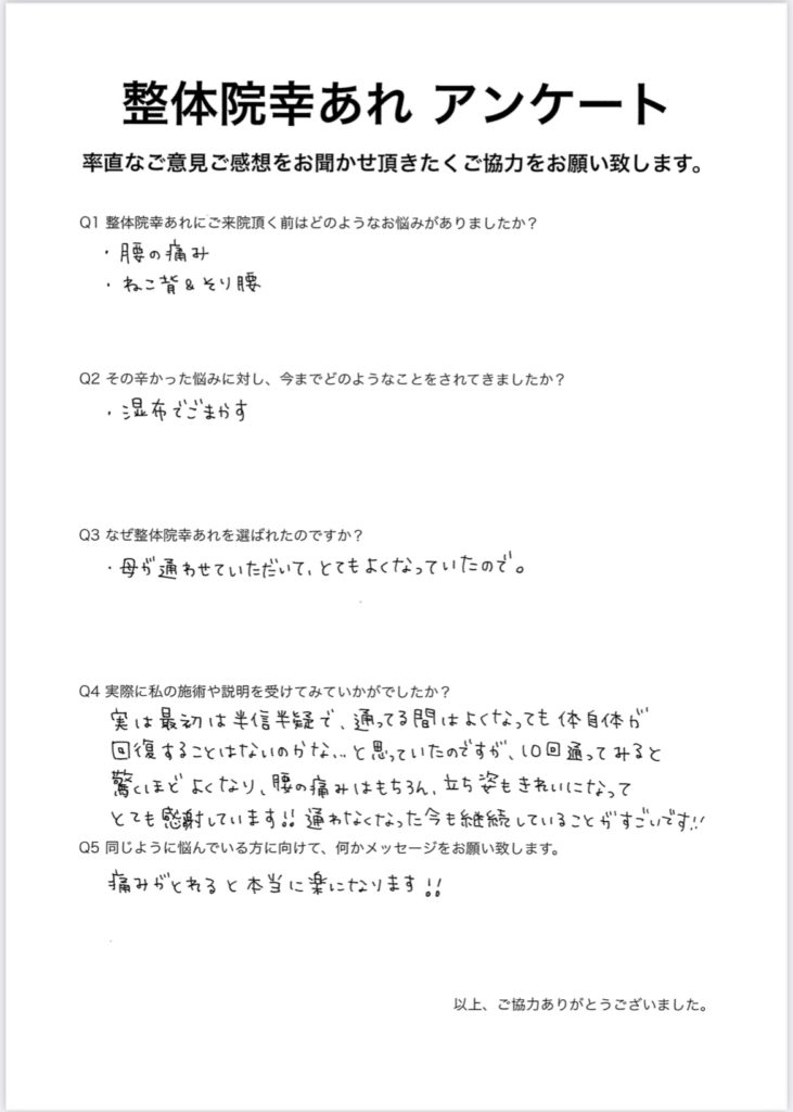 本当に細かい所まで話を聞いてくれるので、精神的にも納得出来ました。 他の所は腰が痛いとか肩こりと言ったら、そこしか施術してくれなかった。 整体院幸あれさんは他と違うなと感じたし、腰痛の原因が首と聞いて驚きました! 痛いところだけみるのではなく、全身みてくれるから通いたいと思いました。