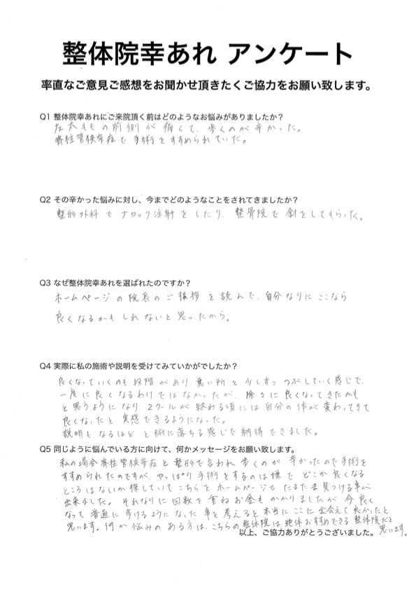 狭窄症で寝れない日々が改善しました。今は感謝しかありません。