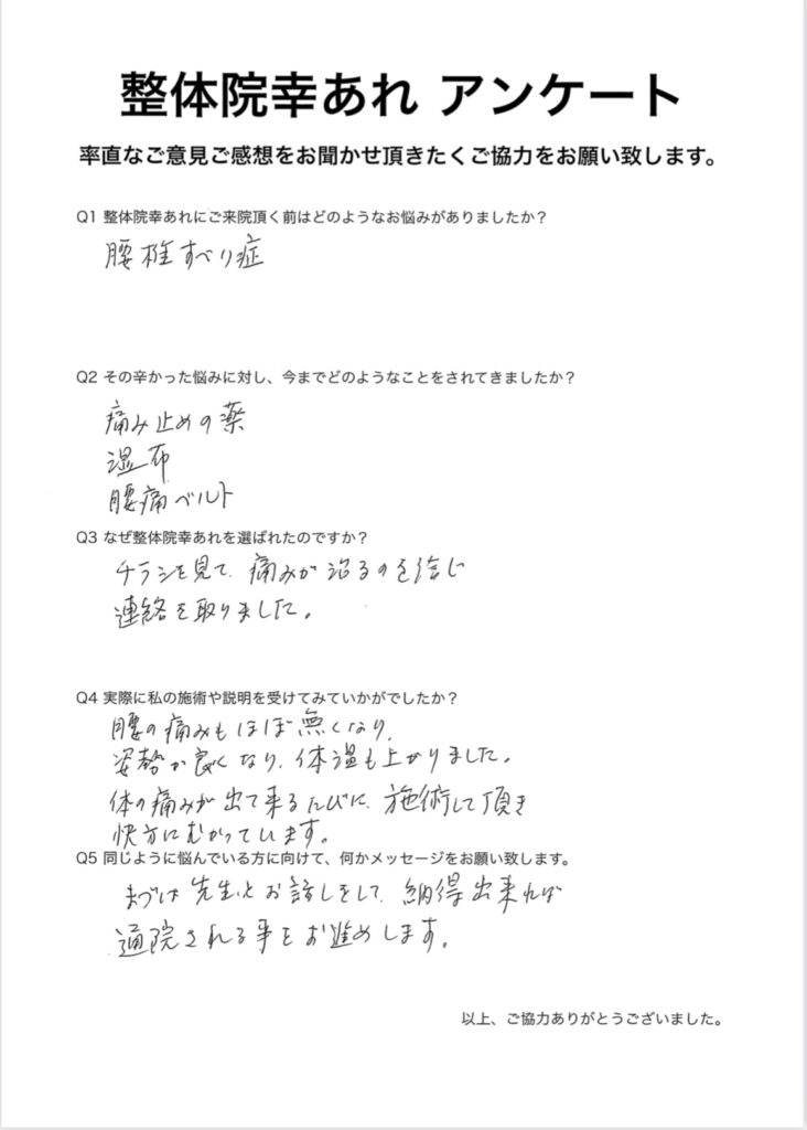 すべり症での腰の痛みと歩くときの辛さが幸あれさんで良くなりました!