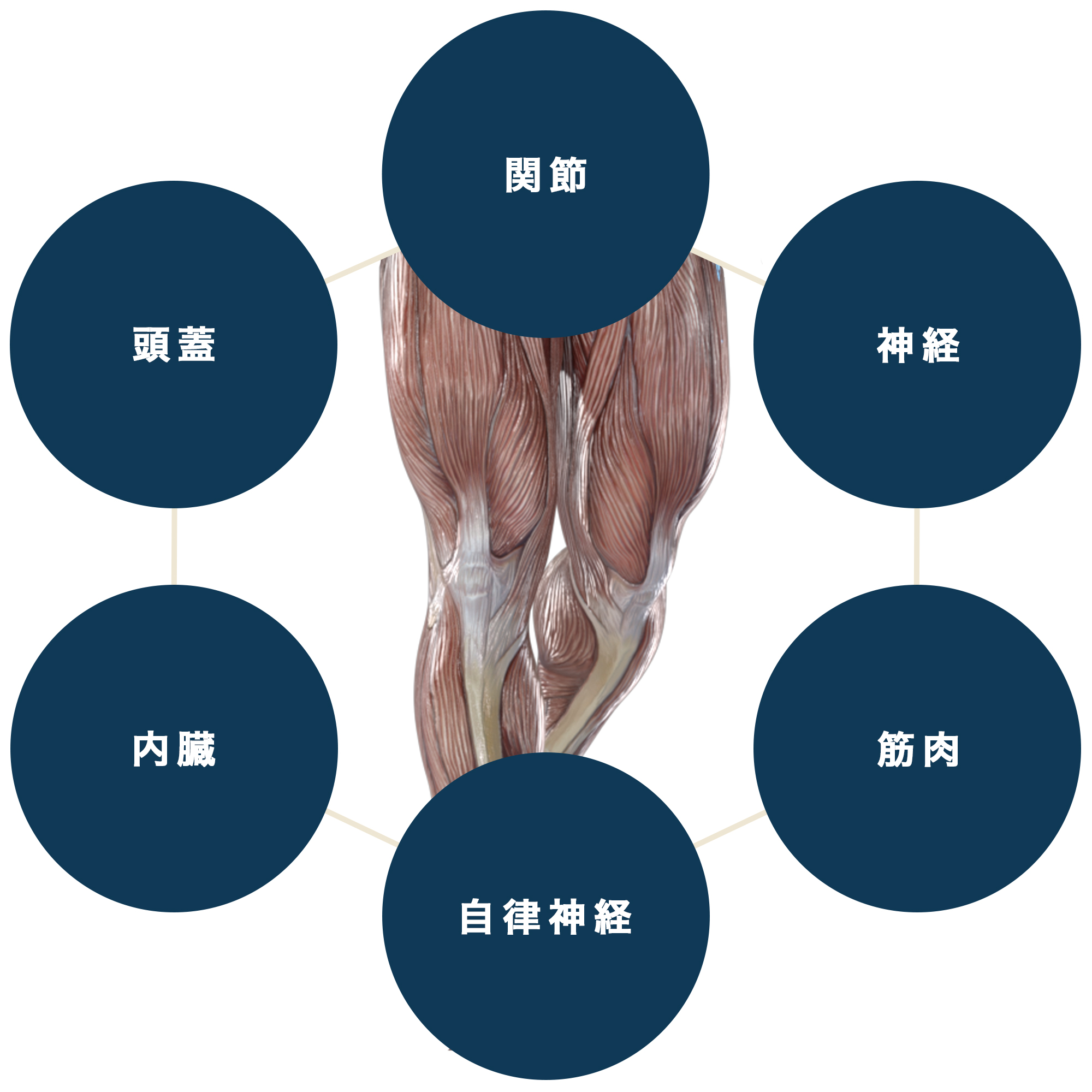 また、上記でも良くならない症状には、自律神経、内臓や頭蓋を調整することで根本的改善を目指していきます。